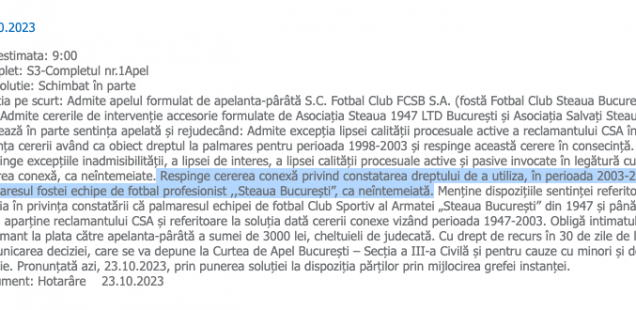 ”Respinge cererea conexă privind constatarea dreptului de a utiliza, în perioada 2003-2017, palmaresul fostei echipe de fotbal profesionist ,,Steaua Bucureşti”, ca neîntemeiată. Menţine dispoziţiile sentinţei referitoare la soluţia în privinţa constatării că palmaresul echipei de fotbal Club Sportiv al Armatei „Steaua Bucureşti” din 1947 şi până în 1998 aparţine reclamantului CSA şi referitoare la soluţia dată cererii conexe vizând perioada 1947-2003.”